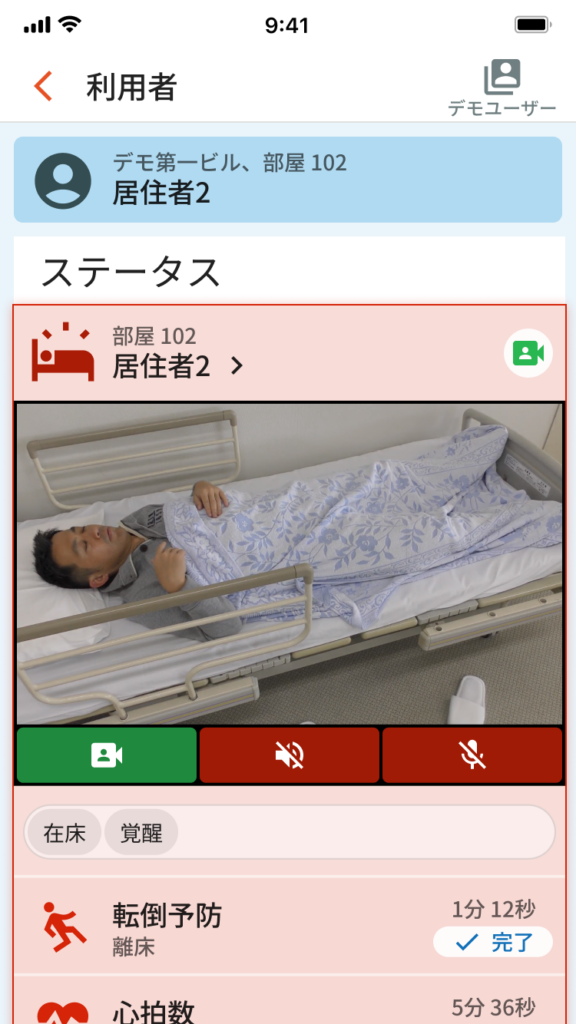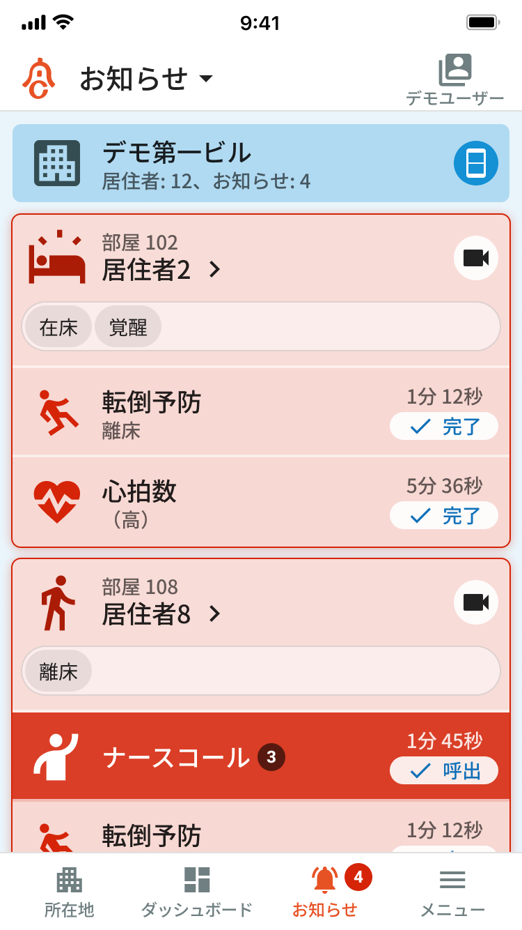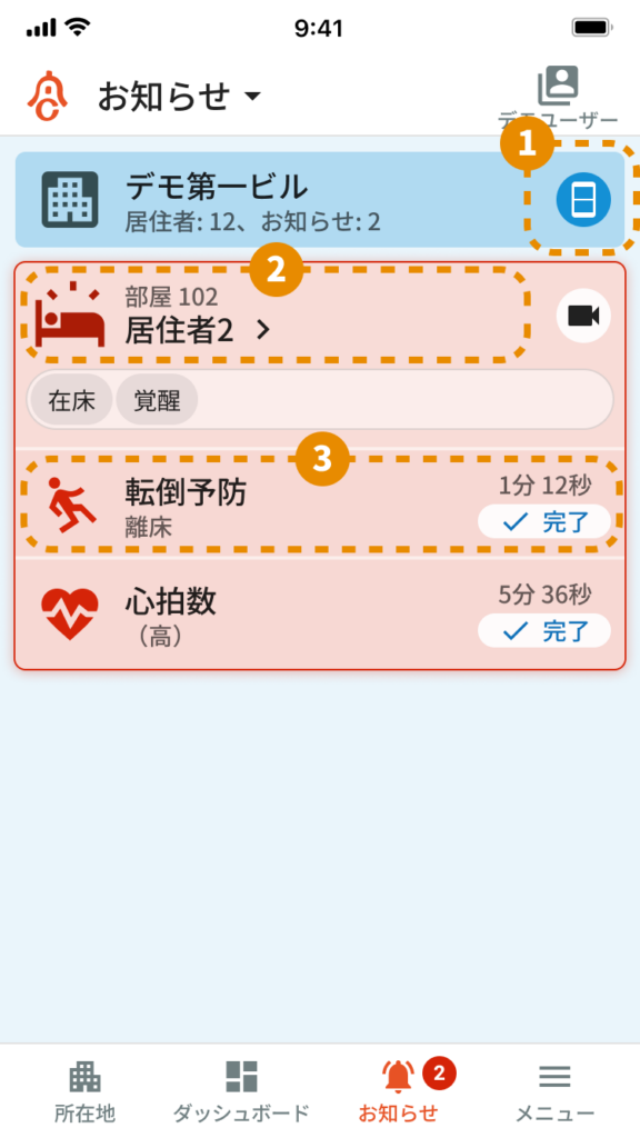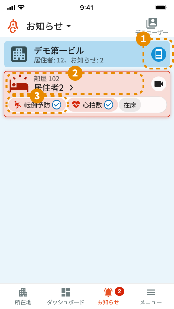 お知らせ画面ははお知らせのある利用者だけを一覧で確認できます。カメラアイコンをタップするとカメラ画像を確認できます。