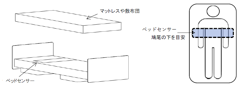 - ベッドセンサーはマットレス/パットマット/布団の下の胸部位置に敷きます。ベットマットの厚みは20 cm以下が望ましいです。