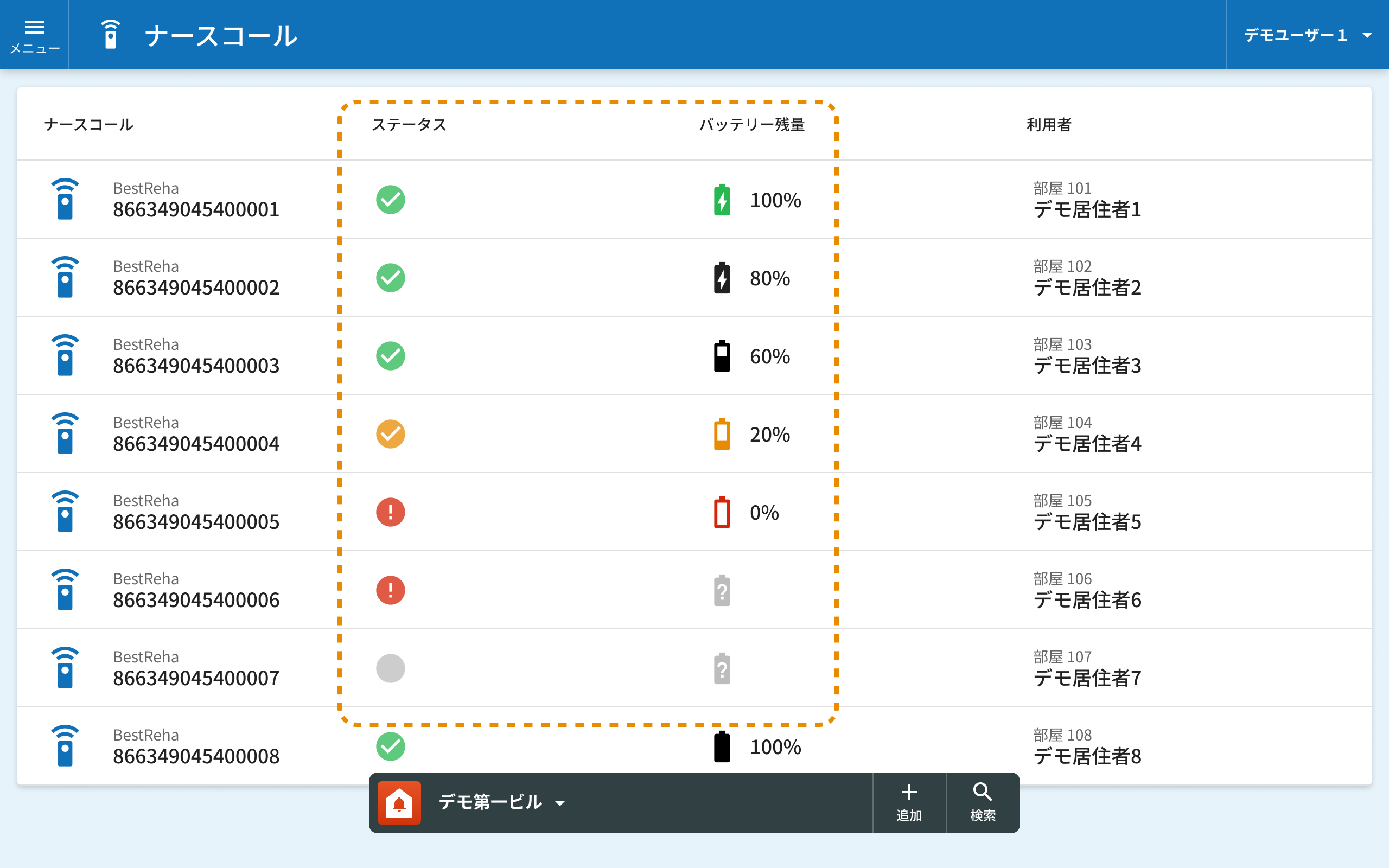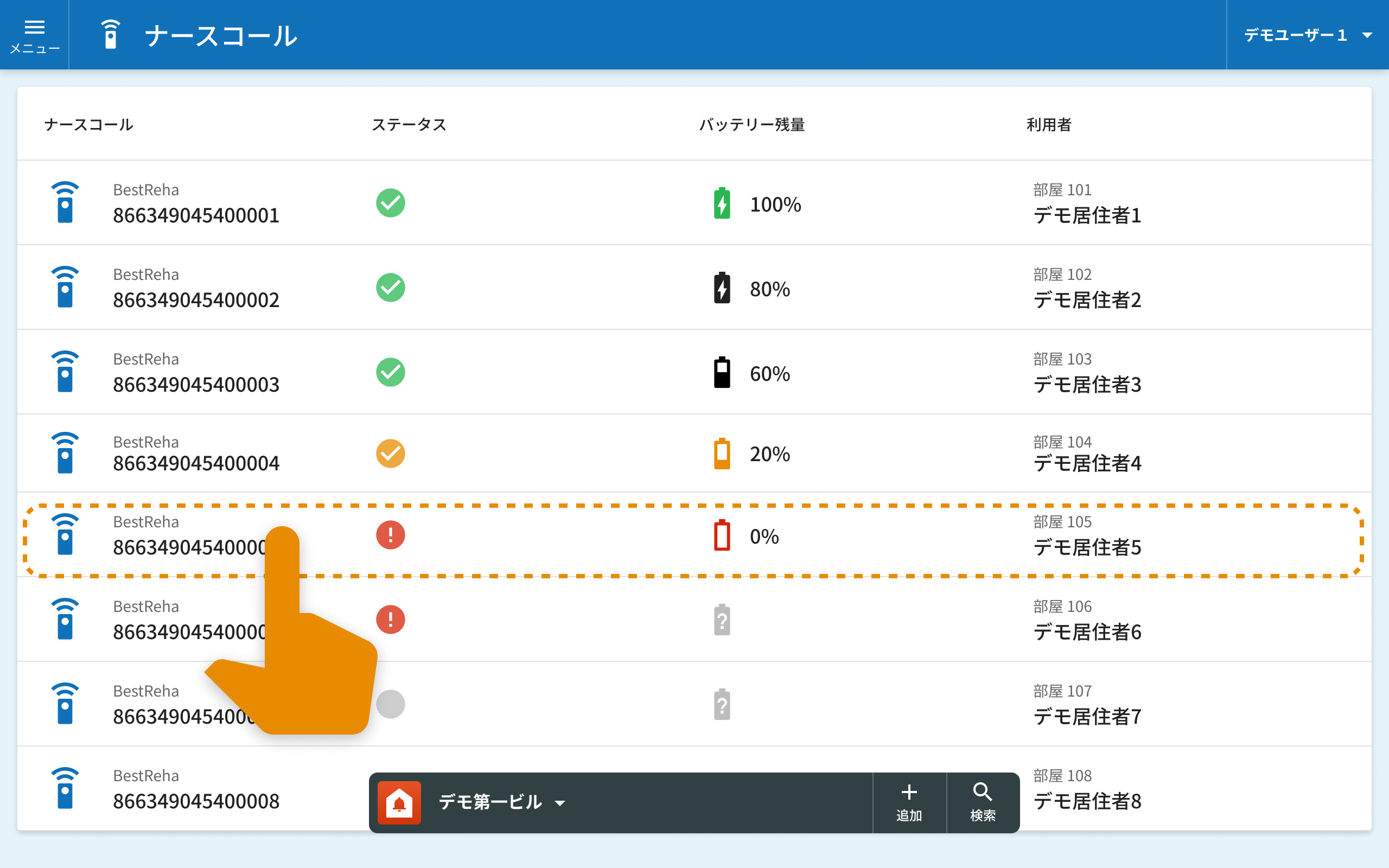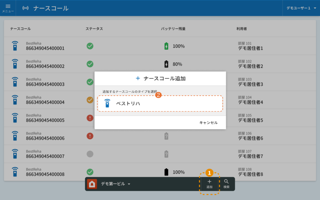 メニューからナースコール選択することで登録されているナースコールの一覧を表示します。