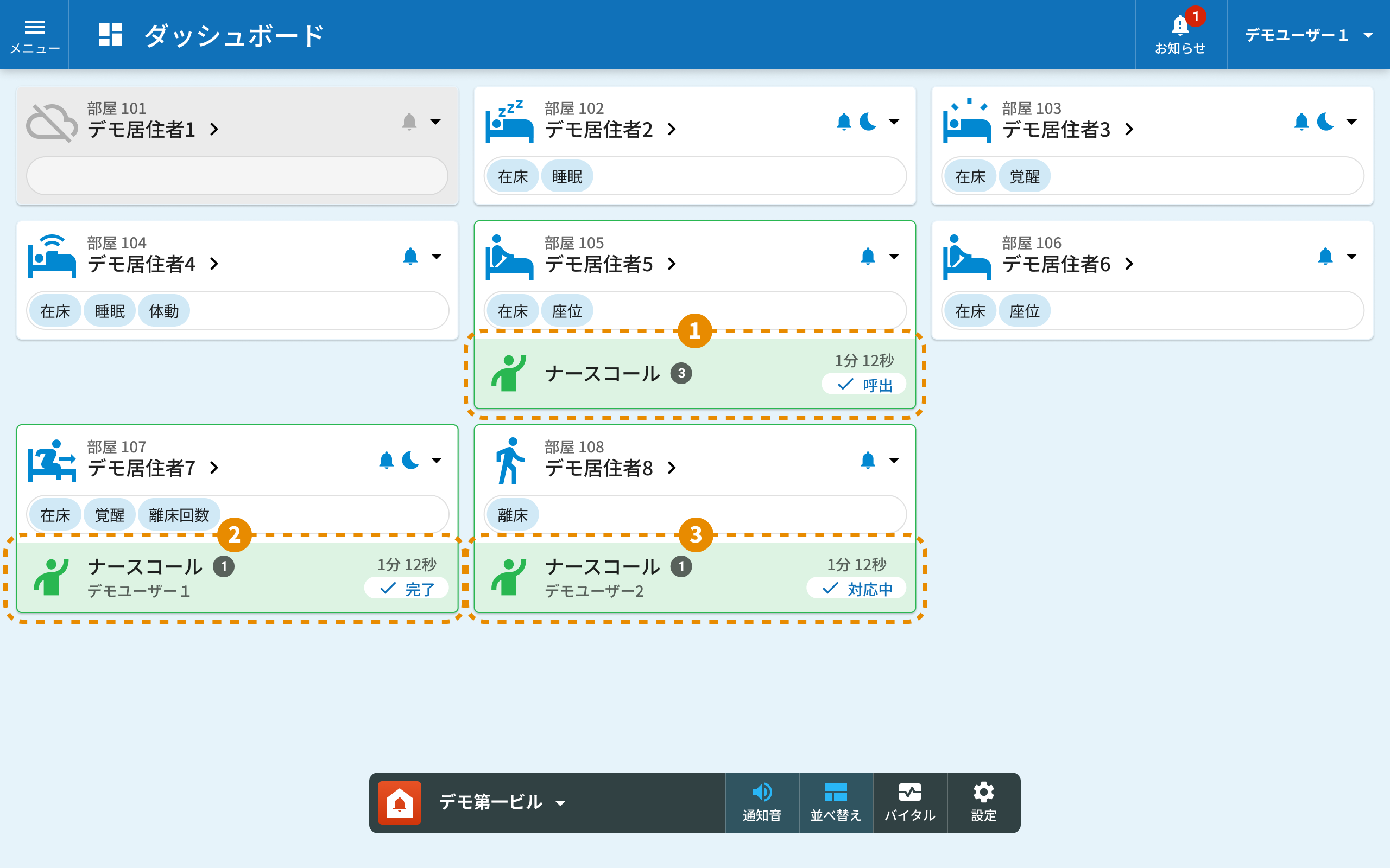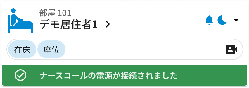 - ナースコールが発報するとダッシュボードにナースコール表示と音声でお知らせします。音声お知らせは他のお知らせと同様に「ひとつのお知らせがあります」という内容です。iPhoneにはプッシュ通知が送信されます。