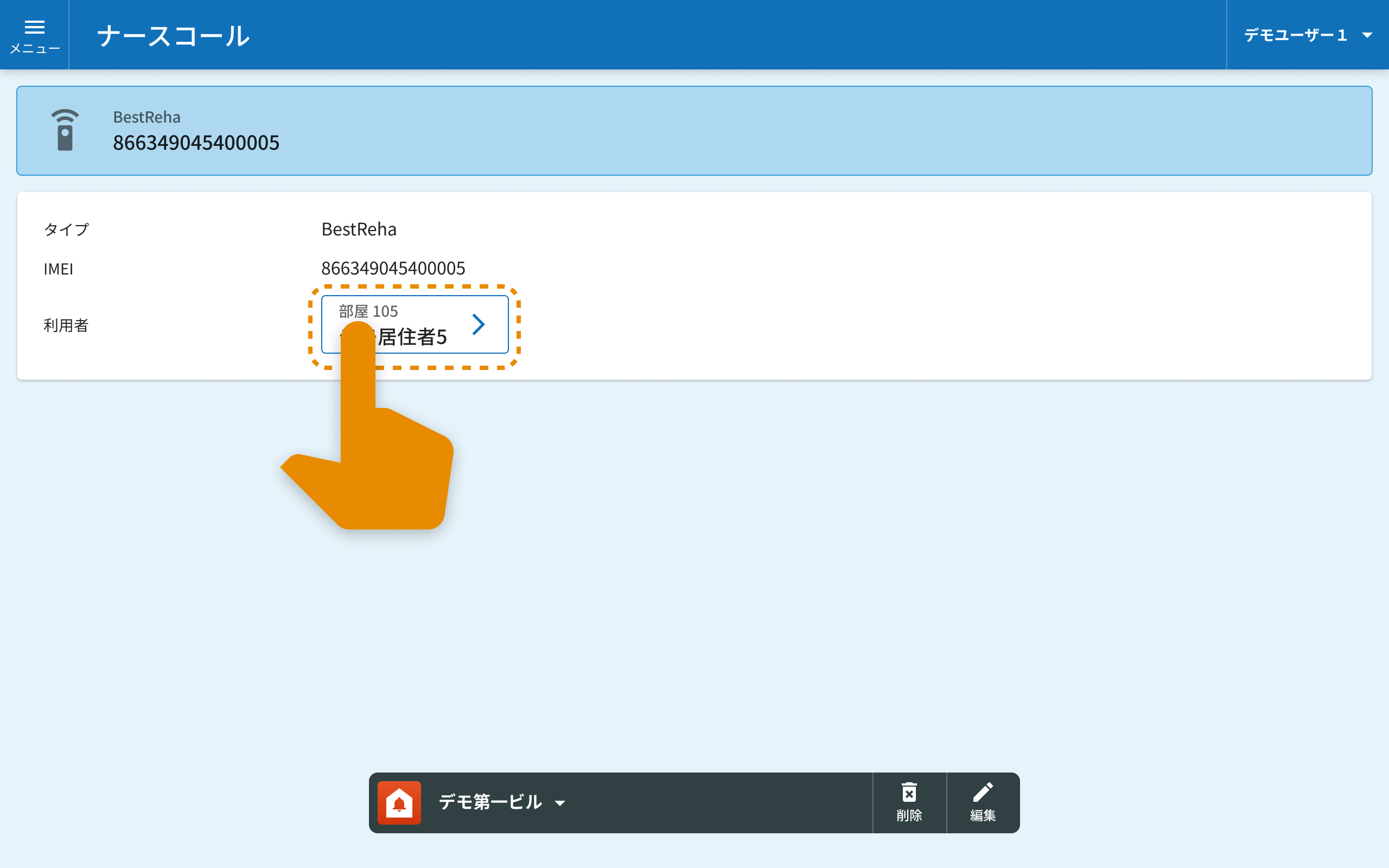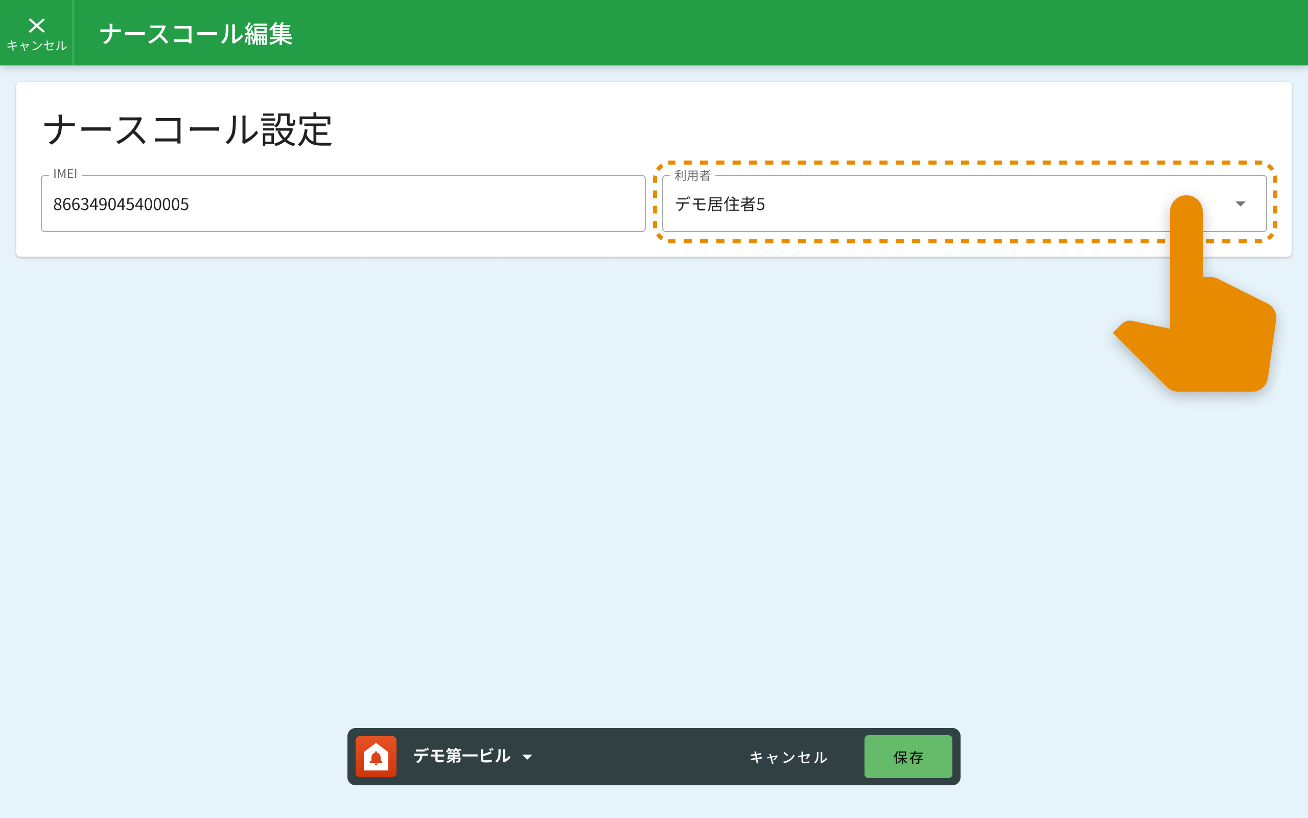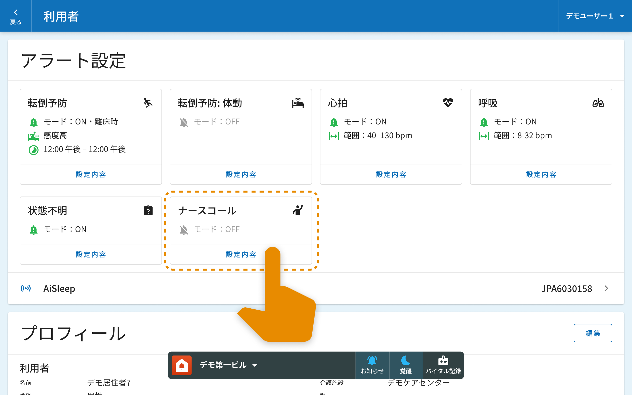 ナースコールの利用者を変更するには、ナースコール設定を開き、利用者を選択しなおします。