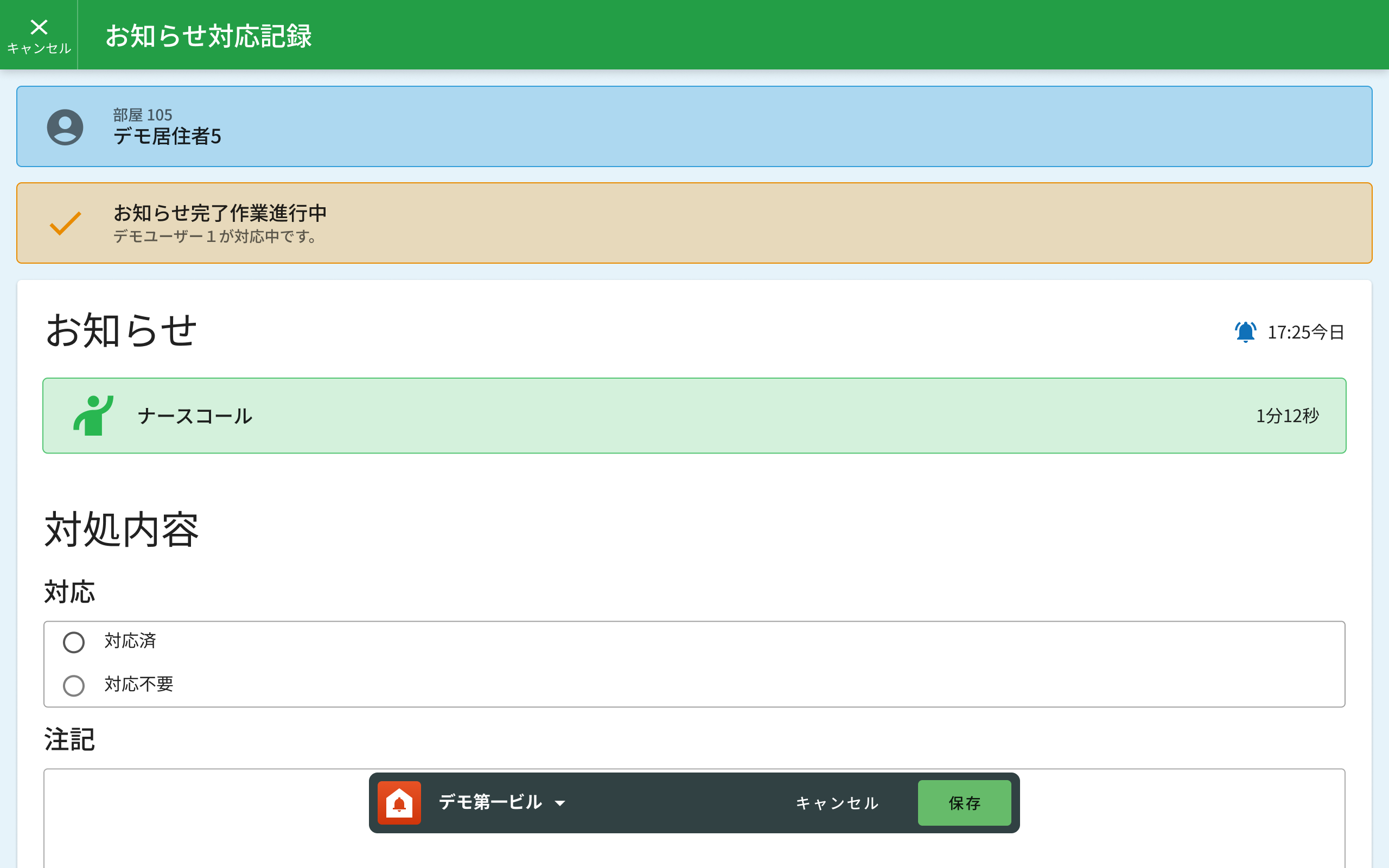 - 対応中の状態で、クリックしたユーザー(対応者名)以外のユーザーがクリックしてもナースコールは解除できません。
