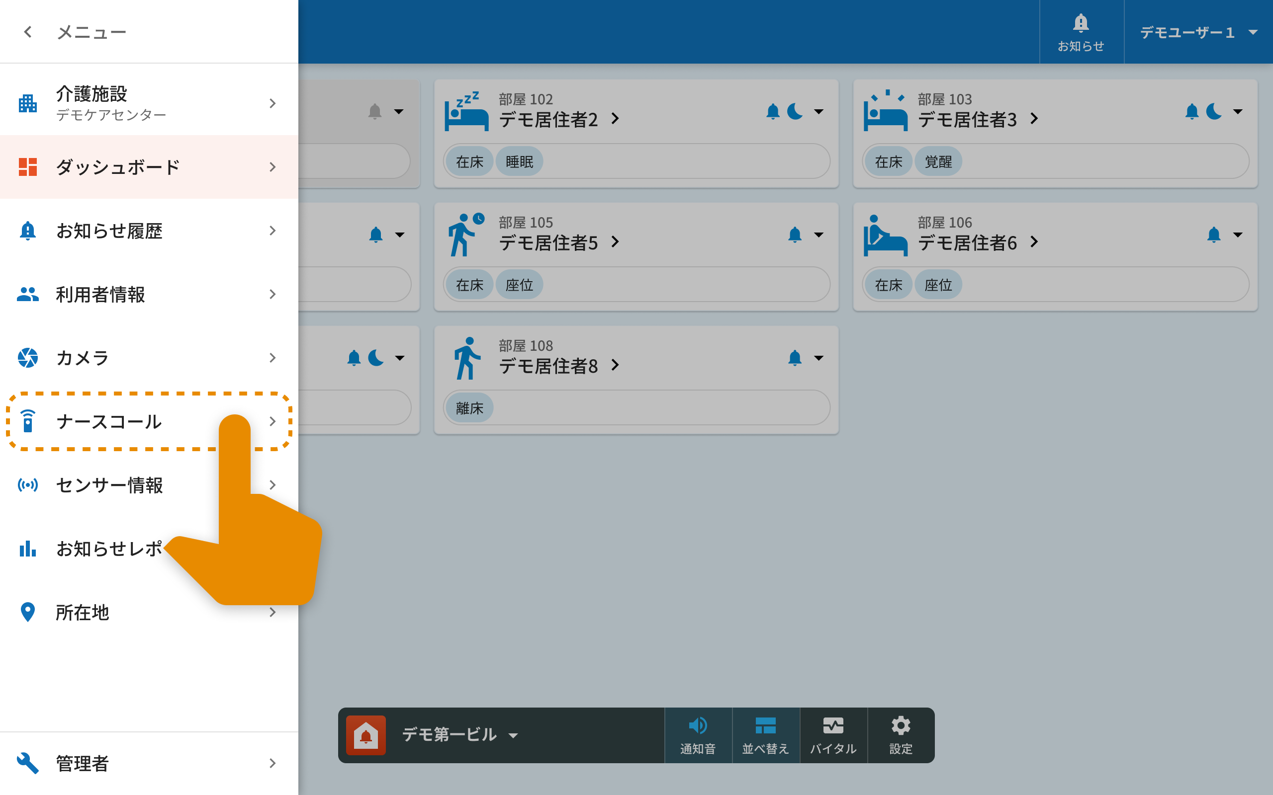 メニューからナースコールを選択します。